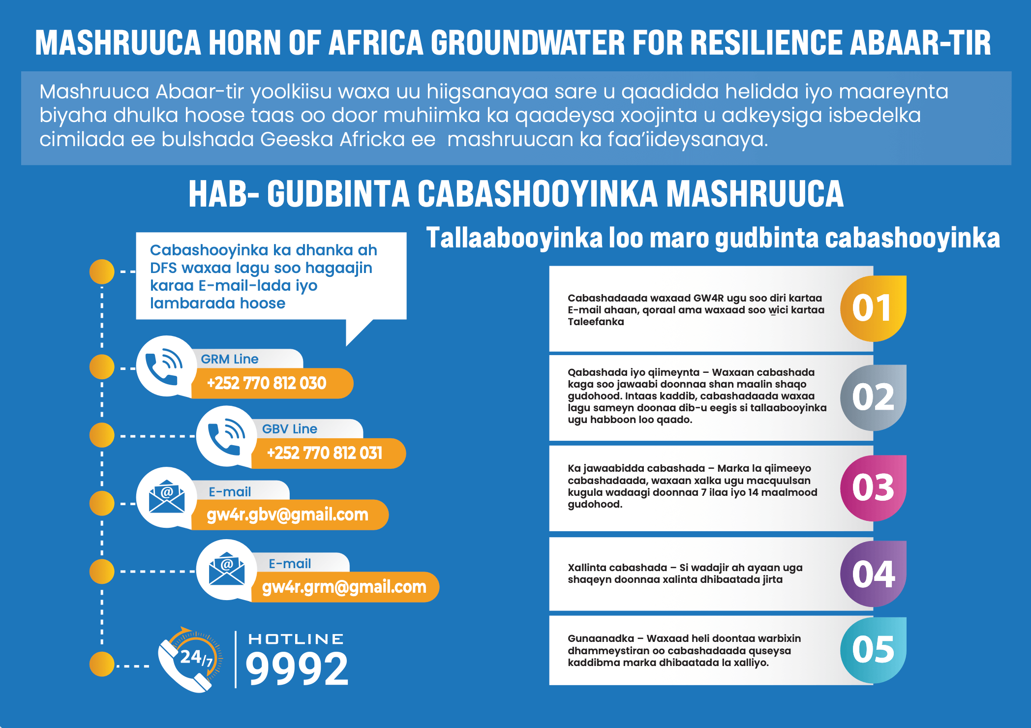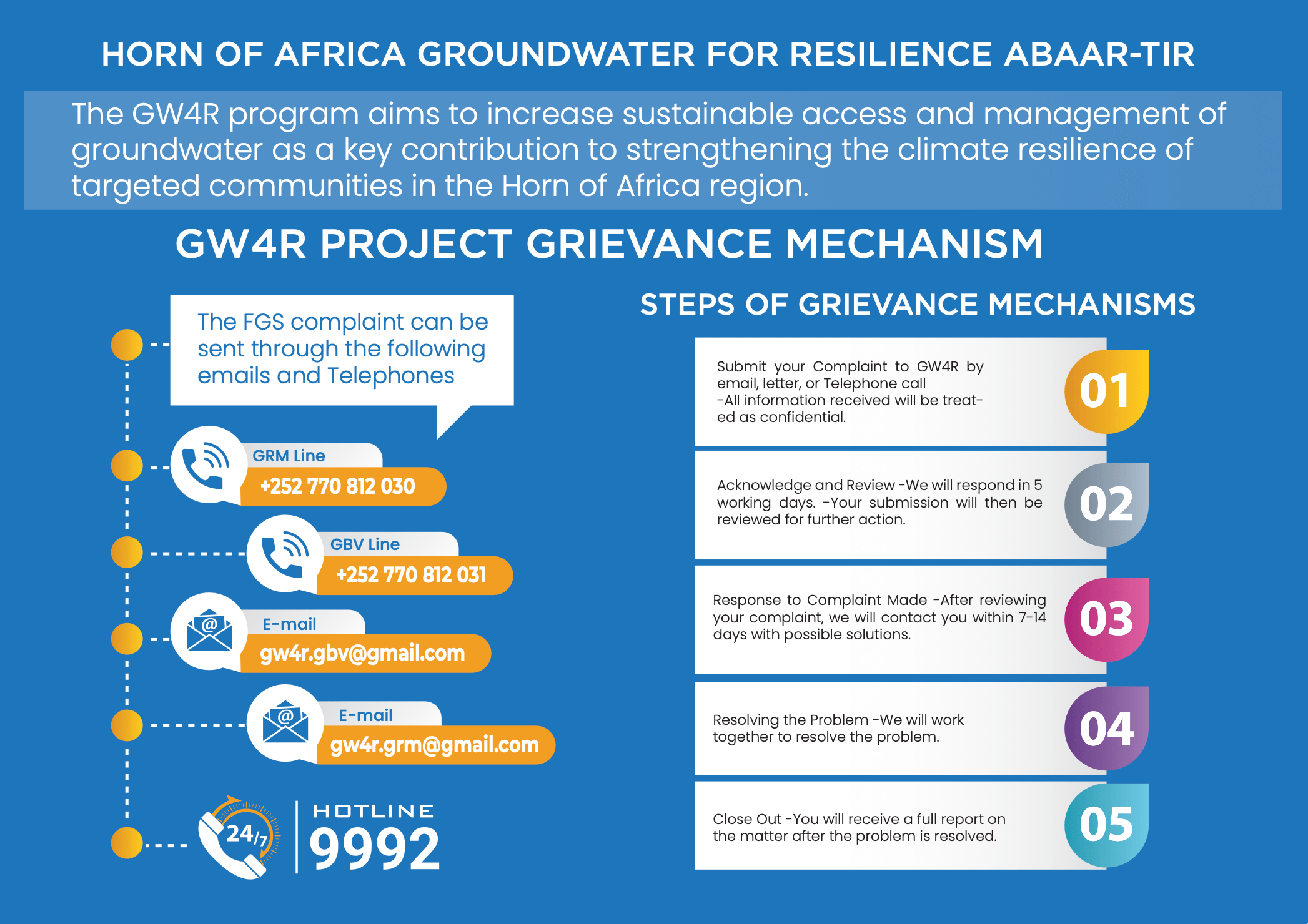 If you have a concern or complaint about the GW4R project, report it now by completing and submitting the GRM form below. Your report is confidential. You can also use the other contact methods provided.